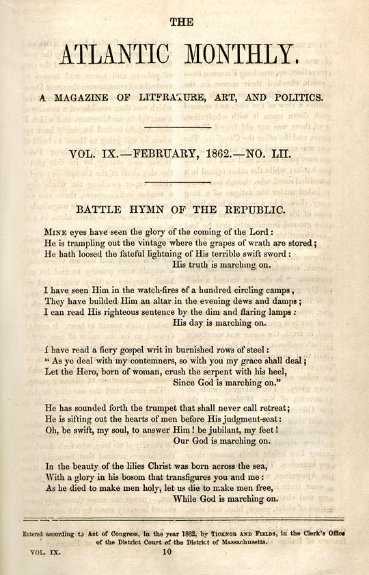 Julia Ward Howe and her husband, both of whom were active abolitionists, observed a skirmish between Confederate and Union troops near Washington, D.C, and heard the troops go into battle singing “John Brown’s Body.” Later that evening, November 18, 1861, a pastor friend encouraged Ward to write a poem more appropriate to the war effort, to be used with the stirring tune. Her words began “Mine eyes have seen the glory of the coming of the Lord.” The Atlantic Monthly paid her four dollars for her poem, and published it in February, 1862, when it became the song we know as “The Battle Hymn of the Republic.” It was popular through the remainder of the Civil War, has encouraged American soldiers and civil-rights activists, and continues to inspire us today.